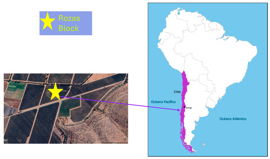 Geographical location of the study site (Rozas Block) within the experimental vineyard situated in the Metropolitan Region of Chile (33°43′7.28″ S; 70°39′53.23″ W).