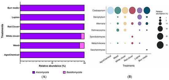 The fungal composition of grape samples from each treatment was mainly represented by two phyla: Ascomycota and Basidiomycota (Figure 2A). As shown in Table S1, Ascomycota was the dominant phylum, accounting for more than 90% of the relative abundance in all samples analyzed. In particular, the control, Bm, and Lu treatments exhibited relative abundances between 99.99% and 100%. Conversely, Basidiomycota was also widely distributed, although at lower levels (~5%). However, in the control, Bm, and Lu treatments, its relative abundance was minimal (0.01–0%).