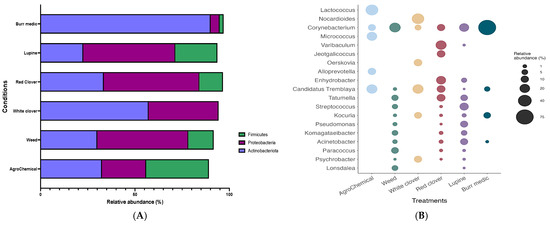 The bacterial composition of grape samples from the different treatments was primarily represented by four phyla (Figure 3A; Table S3): Proteobacteria, Firmicutes, Actinobacteriota, and Chloroflexi. In general, the distribution of these phyla was similar across treatments, with a marked dominance of Proteobacteria. However, the Bm treatment exhibited a higher proportion of Actinobacteriota compared with the other treatments.