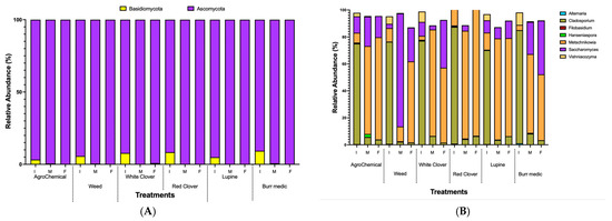 Relative abundance dynamics of dominant fungal during alcoholic fermentation (I. initial; M: medium; F: final) under different vineyard groundcover treatments. (A) phylum level; (B) genus level.