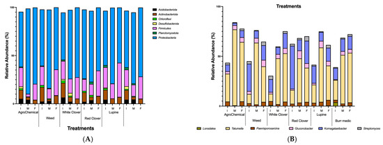 Relative abundance dynamics of dominant bacteria during alcoholic fermentation (I. initial; M: medium; F: final) under different vineyard groundcover treatments. (A) Phylum level; (B) genus level.