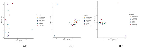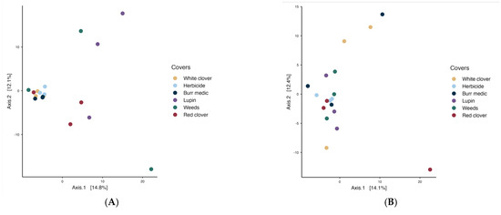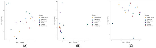 Regarding yeast assemblages PERMANOVA analysis revealed significant differences among covers during the initial stage (p = 0.018; betadisper = 0.539). Nevertheless, pairwise comparisons did not reveal significant differences among treatments, implying that despite minor global variation, the fungal (yeast) assemblages remained broadly consistent across vineyard ground cover types (Table S12). During the intermediate stage (Figure 8B), PERMANOVA detected significant differences in microbial community structure (p = 0.045), but the betadisper test (p = 0.042) indicated heterogeneous dispersion, implying that group variability may have influenced the observed separation. By the final stage (R2 = 0.316; p = 0.226; betadisper = 0.365), no significant differences in yeast composition were detected, and no internal variability among treatments was observed.