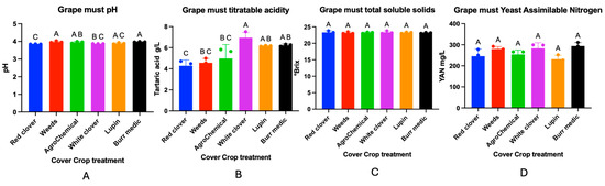 Must composition of Cabernet Sauvignon under different cover crop treatments. Panels represent the following analytical parameters: (A) Grape must pH, (B) Grape must titratable acidity, (C) Grape must total soluble solids, (D) Grape must Yeast assimilable Nitrogen (YAN). Statistical differences are represented by capital letter (A–C).