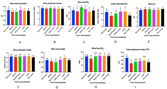 Wine composition of Cabernet Sauvignon under different cover crop treatments. Panels represent the following analytical parameters: (A) Wine reducing sugar, (B) Alcohol content, (C) Total SO2, (D) Color intensity, (E) pH, (F) Titratable acidity, (G) acid volatile, (H) Free SO, and (I) Total polyphenol index (TPI). These measurements summarize the main enological characteristics evaluated across treatments. Statistical differences are represented by capital letter (A, B).