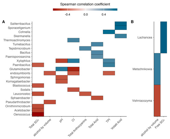 Heatmap of Spearman’s correlation coefficients (ρ) between microbial populations and the physicochemical parameters of wine. (A) correspond to bacterial taxa correlations; (B) correspond to fungi taxa correlations. The color scale represents correlation strength, ranging from −1 (red, strong negative correlation) to +1 (blue, strong positive correlation). Significant correlations (p < 0.05) are highlighted.