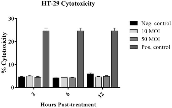 The Colorimetric CyQUANT™ LDH Cytotoxicity Assay Kit (Thermo Fisher Scientific, Greenville County, SC, USA) was used to evaluate the effects of two concentrations of C. jejuni on the viability of HT-29 cells. Briefly, cells were seeded as described above and incubated with live Campylobacter at an MOI of 10 or 50. For spontaneous LDH release, triplicate wells were incubated with 10 µL of sterile medium. An additional five replicate wells of non-infected cells served as the negative control. After 2, 6, and 12 h of incubation at 37 °C, 10 µL of 10× lysis buffer was added to each well to determine maximum LDH release. LDH supplied in the kit was used as a positive control, in accordance with the manufacturer’s instructions. The plate was then incubated for 45 min at 37 °C, and the supernatants were collected. Cellular cytotoxicity was quantified in five independent HT-29 culture replicates, as per the manufacturer’s instructions. Optical density (OD) was measured at 490 nm, and the percentage of cytotoxicity was calculated using the following formula: