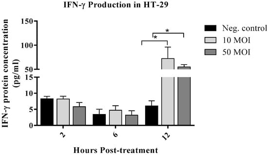 Interferon (IFN)-γ levels in six biological replicates of HT-29 cells following infection with Campylobacter jejuni at 10 or 50 MOI for 2, 6, and 12 h. Data were analyzed using one-way analysis of variance (ANOVA), followed by Tukey’s multiple comparison test. Results are presented as the mean ± SEM. Asterisks (*) indicate statistically significant increases in IFN-γ production (p < 0.05).
