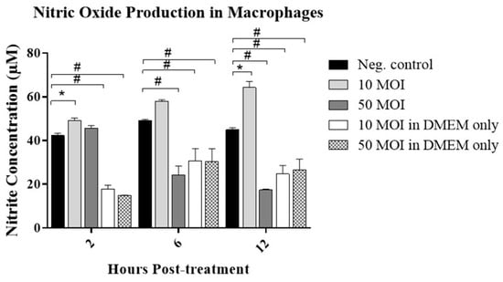 Nitric oxide (NO) production by RAW 264.7 cells following treatment with the supernatant from five biological replicates of C. jejuni–infected HT-29 cells at 10 or 50 MOI or Campylobacter cell-free supernatant for 2-, 6-, and 12-h. Data were analyzed using one-way analysis of variance (ANOVA), followed by Tukey’s multiple comparison test. Results are presented as the mean ± SEM. Asterisks (*) indicate statistically significant increases in NO production (p < 0.05), while pound symbols (#) indicate statistically significant decreases (p < 0.05).