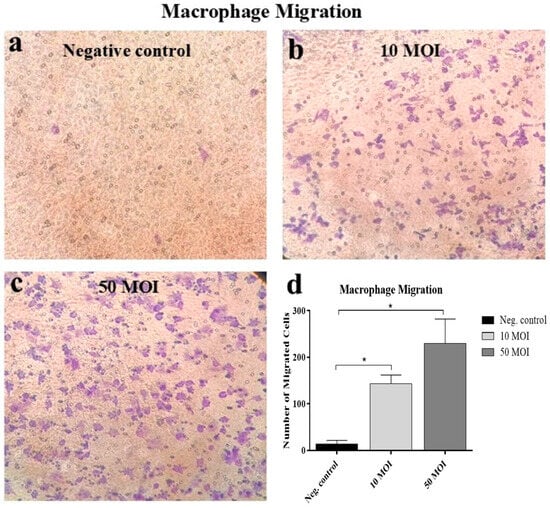 RAW 264.7 cell migration across the transmembrane in response to supernatants from six biological replicates of HT-29 cultures infected with Campylobacter (MOI 10 or 50) for 24 h. Migrated cells were stained with crystal violet in the negative control/untreated group (a), cells treated with supernatants from HT-29 cells infected with Campylobacter at MOI 10 (b), and cells treated with supernatants from HT-29 cells infected at MOI 50 (c). Panel (d) shows quantification of migrated cells across multiple fields. Data were analyzed using one-way analysis of variance (ANOVA), followed by Tukey’s multiple comparison test. Results are presented as the mean ± SEM. Asterisks (*) indicate statistically significant increases in cell migration (p < 0.05). The experiment was repeated twice, yielding a similar migration pattern.