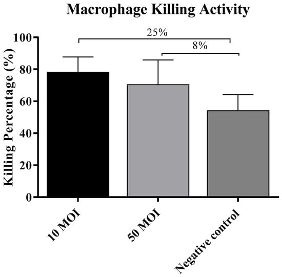To assess whether macrophage activation enhances their ability to kill Campylobacter, a gentamicin protection assay was performed. Although the killing percentage was numerically higher in macrophages treated with supernatants from Campylobacter-infected HT-29 cells at both 10 and 50 MOI (25% and 8%, respectively), it was not significantly different from that observed in macrophages treated with supernatants from non-infected cells (Figure 6). Raw data are provided in Supplementary Table S1.