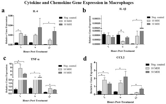 Gene expression of interleukin (IL)-6 (a), IL-1β (b), tumor necrosis factor alpha (TNF-α) (c) and C-C motif chemokine ligand 2 (CCL2) (d) was measured in six biological replicates of RAW 264.7 cells using quantitative real-time PCR (qRT-PCR) following treatment with supernatants from C. jejuni–infected HT-29 cells (MOI 10 or 50) for 2, 6, or 12 h. Data were analyzed using one-way analysis of variance (ANOVA), followed by Tukey’s multiple comparison test. Results are presented as mean ± SEM. Asterisks (*) indicate statistically significant increases in gene expression (p < 0.05), while pound symbols (#) indicate statistically significant decreases (p < 0.05).