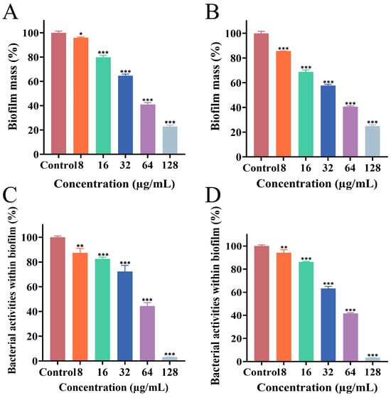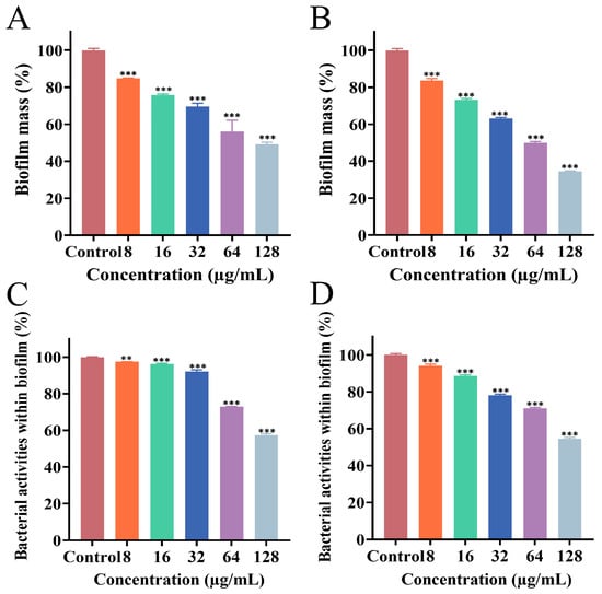 Effects of different concentrations of PEE on mature MRSA ATCC 43300 biofilm (A,C) and mature MRSA CI2 biofilm (B,D). (A,B) Biofilm biomass assessed by CV staining assay; (C,D) biofilm activity amount assessed by XTT sodium reduction assay (** p < 0.01, *** p < 0.001).