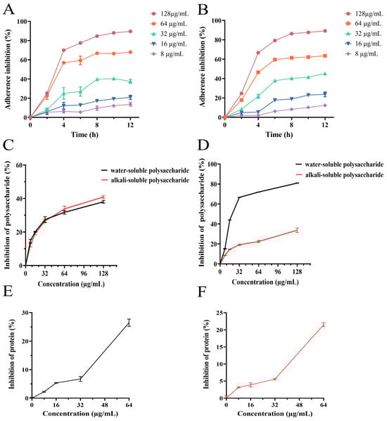 Extracellular polysaccharides play a key role in bacterial adhesion. Alkali-soluble polysaccharides are extracellular glucans that play important roles in biofilm formation and consolidation. Water-soluble polysaccharides provide nutrients for adherent and aggregated bacteria. In this study, a phenol–sulfuric acid assay was performed to determine the effect of PEE on the synthesis of MRSA alkali- and water-soluble polysaccharides. The results are shown in Figure 4C,D. Relative to untreated control, after treatment with PEE at a concentration of 8–64 μg/mL, PEE significantly inhibited the synthesis of extracellular polysaccharides in a significant concentration-dependent manner. These findings demonstrate that PEE significantly inhibited the synthesis of extracellular polysaccharides by MRSA.
