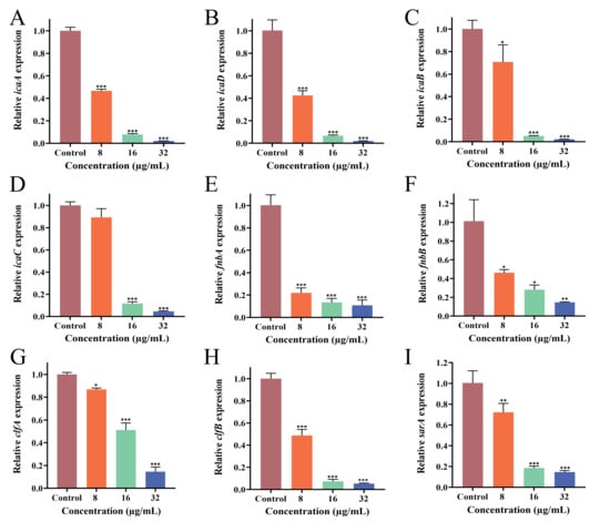 Effects of different concentrations of PEE on the expression of the icaA, icaD, icaB, icaC, fnbA, fnbB, clfA, clfB and sarA genes of MRSA ATCC 43300. (A) PEE inhibits the expression of icaA; (B) icaD; (C) icaB; (D) icaC; (E) fnbA; (F) fnbB; (G) clfA; (H) clfB; (I) sarA. (* p < 0.05, ** p < 0.01, and *** p < 0.001).