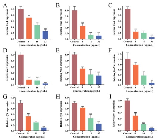 MRSA expresses extracellular polysaccharides and proteins that enable the bacteria to adhere, thereby promoting biofilm formation and aggregation. RT-qPCR was used to evaluate the effect of PEE on the expression of associated genes.