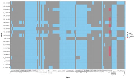 Virulence factors identified in twenty-one genetically distinct bovine non-O157:H7 Escherichia coli strains. Virulence factors were identified using Abricate (v1.0.1) to query the virulence factor database (VFDB) and generate virulence profiles for each isolate. Blue cells denote a virulence factor presence while gray cells denote a virulence factor absence. Red cells denote the presence of stx2A and stx2B, genes required for production of Shiga toxin.