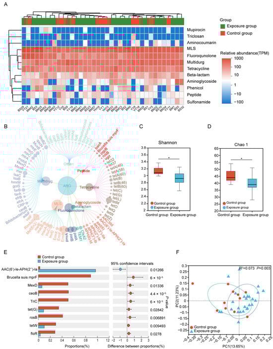 The composition and differences of ARGs between the exposure and control groups. (A) The classes of ARGs in different groups. (B) The antibiotic resistance subtypes of each class (the size of each node is proportional to the abundance). (C,D) Alpha diversity estimates of oral microbial ARGs diversity and statistical significance (Wilcoxon test) between the two groups. (E) Differences in the average relative abundance of ARGs(subtypes) between two groups (* p ≤ 0.05). (F) Binary Jaccard-based Principal coordinates analysis (PCoA) of the ARGs from the different groups. ARGs, antibiotic resistance genes.
