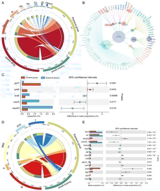 For MRGs, 83 subtypes were detected across 11 types through seraching the BacMet database (Figure 3A,B). Multimetal-related resistance genes predominated in both the exposure group (57.95%) and control group (63.09%), followed by resistance genes for iron (Fe) (17.83% vs. 15.75%) and aluminum (Al) (10.99% vs. 8.41%). Resistance genes associated with mercury (Hg), selenium (Se), copper (Cu), and zinc (Zn) were below 5% (Figure 3A). MRG alpha diversity showed the same patterns as ARG diversity between the two groups (Figure S2B,C). The Cu-resistant gene tcrB and the Hg-resistant genes merA and merR were significantly enriched in the exposed group (Figure 3C).