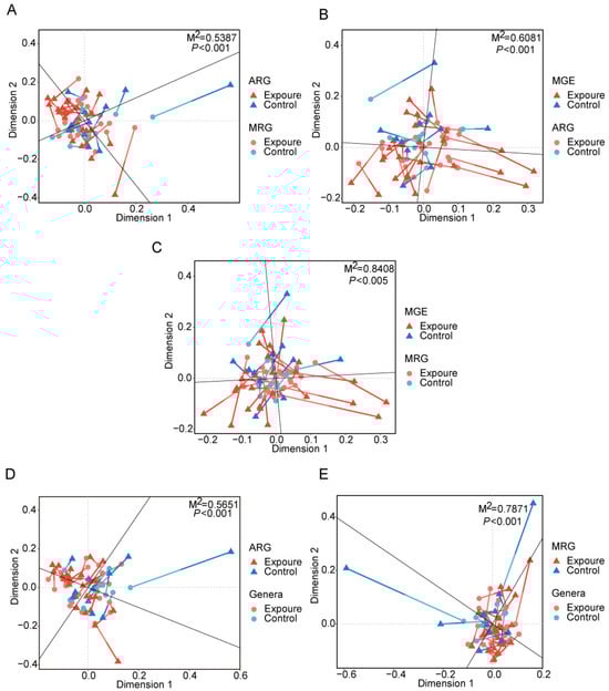 Procrustes analyses displaying significant correlations between (A) ARGs and MRGs, (B) ARGs and MGEs, (C) MRGs and MGEs, (D) ARGs and microbial community, (E) MRGs and microbial community. MRGs, metal resistance genes. MGEs, mobile genetic elements.