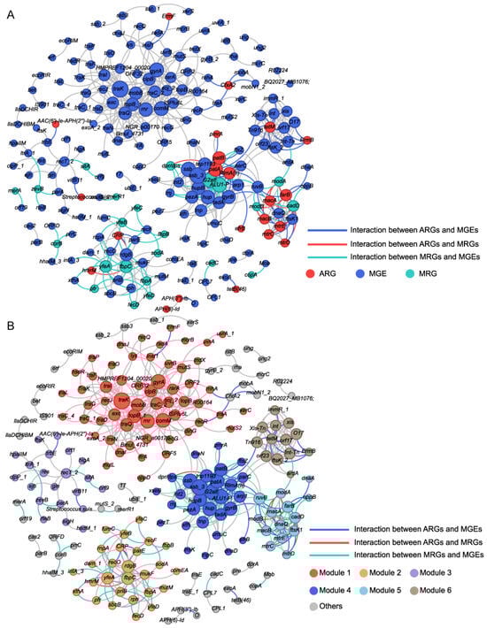 Co-occurrence patterns between MRGs, ARGs, and MGEs in all oral samples. (A) Each node was colored according to the MRGs, ARGs, and MGEs. (B) Each node was colored according to different modularity. Node size is proportional to the number of connections. Interactions of the same type are linked by gray lines.