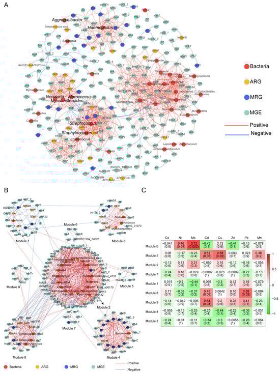 Network analysis shows MRGs, ARGs, and MGEs co-occurrence with microbial communities. (A) The co-occurrence patterns between the genes and bacteria in all oral samples. Each edge represents a strong and significant correlation (r > 0.65 (or <−0.65), p < 0.05). Nodes represent ARGs, MRGs, MGEs, and bacterial species at genera. (B) Coexistence network modules of genes and bacteria of oral samples from 15 subjects screened in the exposure group (determined by fast greedy module optimization method, only nodes greater than 5 are shown). (C) Correlation between blood metal levels and bacteria and genes in the module of 15 study subjects. Numbers represent correlation coefficients (r) and significance (P) is in parentheses.