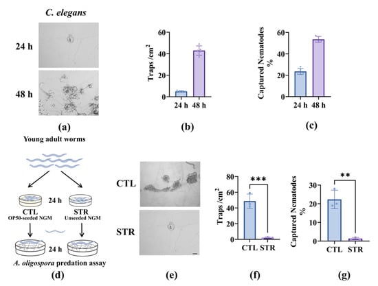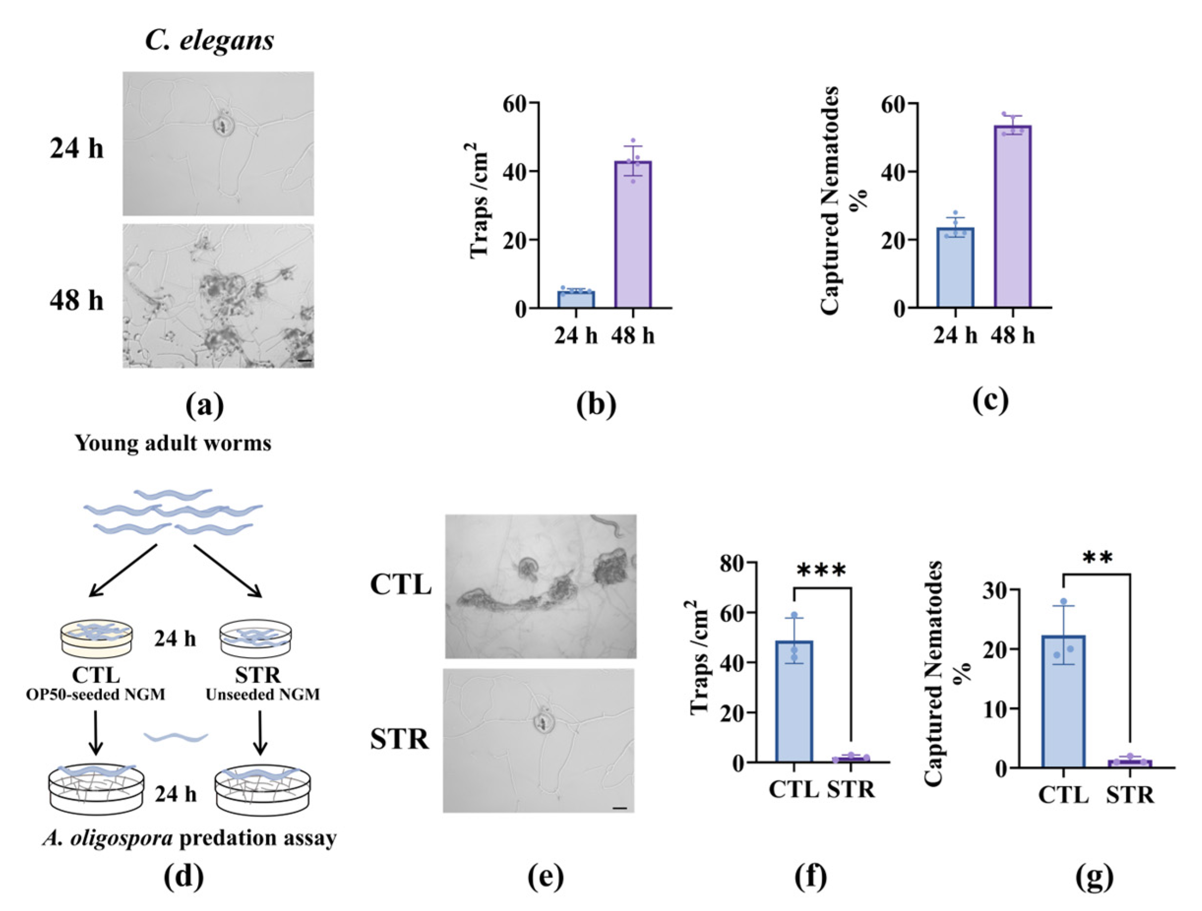 Nematode starvation reduced the predatory capacity of A. oligospora: (a) Representative images of C. elegans at 24 h–48 h on A. oligospora plates. Scale bar: 100 μm. (b,c) Quantification of adhesive trap density (traps/cm2) (e) and captured fraction (%) (f). These results (b,c) are from three independent experiments. (d) Schematic of the starvation (STR) treatment paradigm compared to the fed control (CTL) under the same density of worms, n = 50. Synchronized young adult C. elegans were maintained for 24 h on OP50-seeded NGM or on unseeded NGM, then transferred at equal density to A. oligospora predation plates. (e) Representative images showing fewer adhesive traps surrounding starved worms than controls. Scale bars, 100 μm. (f,g) Quantification under CTL versus STR, trap density (f), and captured fraction (g). These results are means ± SD of three independent experiments. ** p < 0.01, *** p < 0.001. p-values (f,g) were calculated using Student’s t-test.