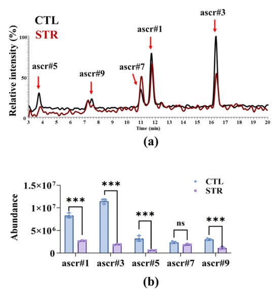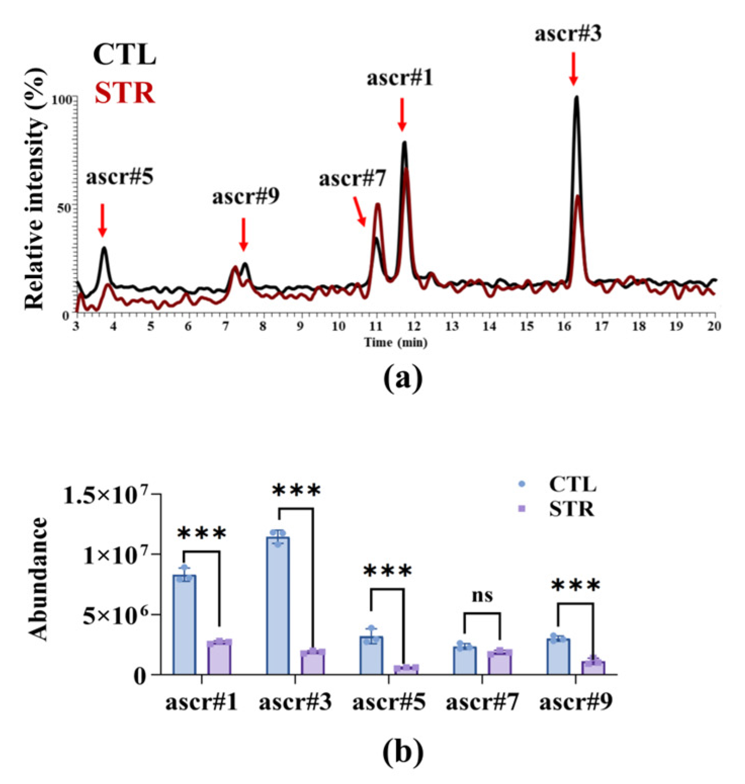 The CTL and STR worms were placed into pre-weighed 15 mL tubes, washed three times with sterile water, snap-frozen, and then lyophilized for 12 h. Dry mass was recorded to ensure consistency across samples (≥10 mg each). For extraction, 700 µL of 50% methanol was added. The samples were then sonicated in a pre-cooled water bath for 20 min at 50% amplitude with a 6-s-on/6-s-off duty cycle, followed by centrifugation for 15 min at 4 °C at 12,000 rpm. Supernatants were filtered through 0.2 µm PTFE membranes into LC vials (approximately 500–600 µL). UHPLC and HRMS (Orbitrap FTMS) were performed to analyze metabolites using ESI+ in full-scan mode (m/z 70–1000). Extracted-ion chromatograms (EICs) were generated at exact-mass windows corresponding to the targeted ascarosides 219.0858-219.0880 (ascr#5), 247.1170-247.1194 (ascr#9), 273.1325-273.1353 (ascr#7), 275.1481-275.1509 (ascr#1), and 301.1636-301.1666 (ascr#3). Peaks were integrated with fixed retention-time windows. Relative abundances were derived from peak areas and normalized to the dry mass of each worm sample to allow comparison between CTL and STR groups. The assay was carried out through three independent experiments.