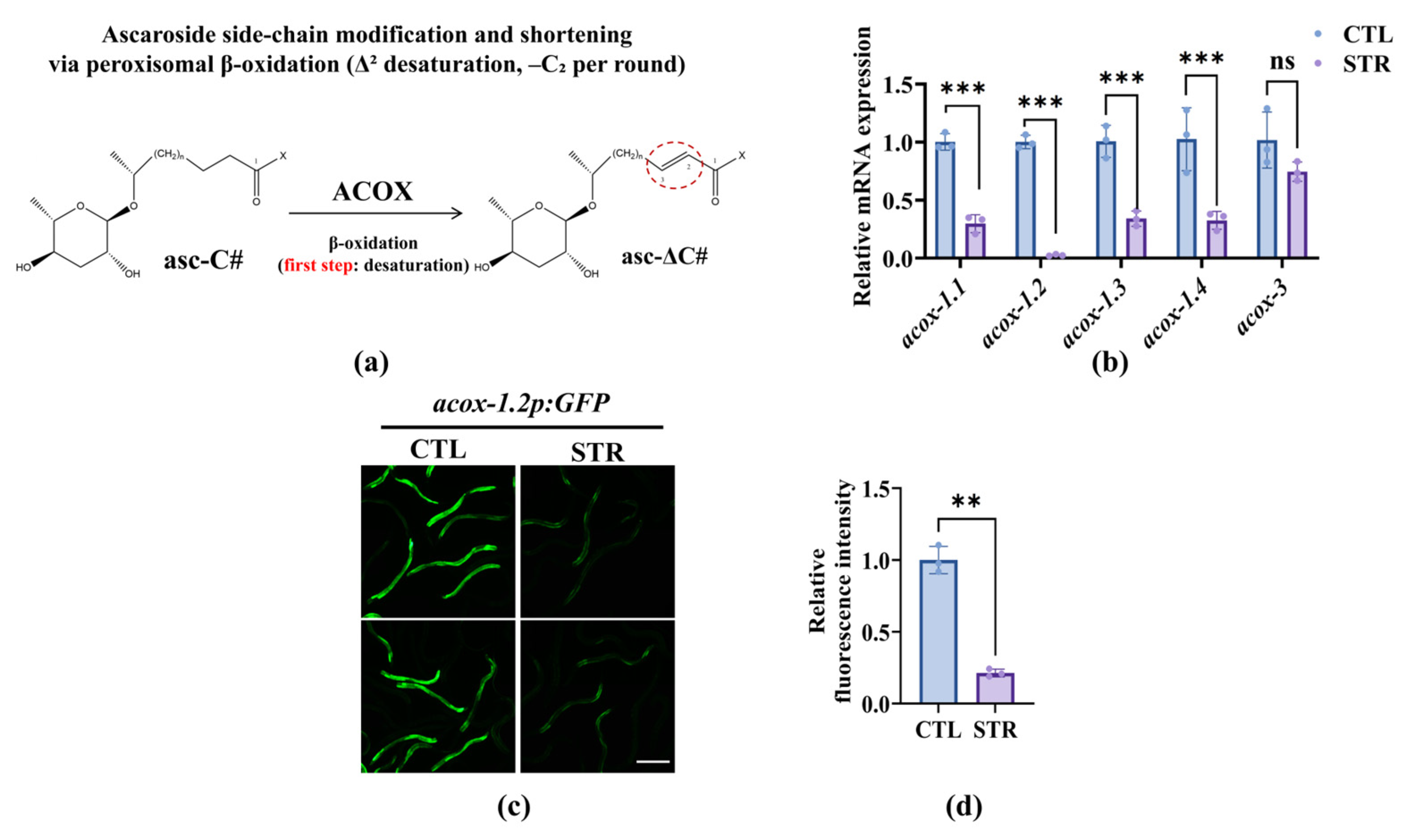 Nutritional stress represses the mRNA Level of the acox-1 isoforms: (a) Schematic of ascaroside side-chain editing/shortening via peroxisomal β-oxidation (first step). ACOX denotes acyl-CoA oxidase in the β-oxidation cycle. (b) The mRNA level of acox isoform genes. STR reduced acox-1.1, acox-1.2, acox-1.3, and acox-1.4 mRNA, whereas acox-3 was unchanged. These results are means ± SD of three independent experiments. ns, no significance, *** p < 0.001. p-values were calculated using two-way ANOVA with Šidák’s correction for multiple comparisons. (c) Representative fluorescence images of the transcriptional reporter acox-1.2p::GFP in CTL and STR animals. Scale bar, 100 µm. (d) Quantified reporter intensity shows decreased acox-1.2 promoter activity under STR. These results are means ± SD of three independent experiments (n = 30 per group). ** p < 0.01. p-values were calculated using Student’s t-test.