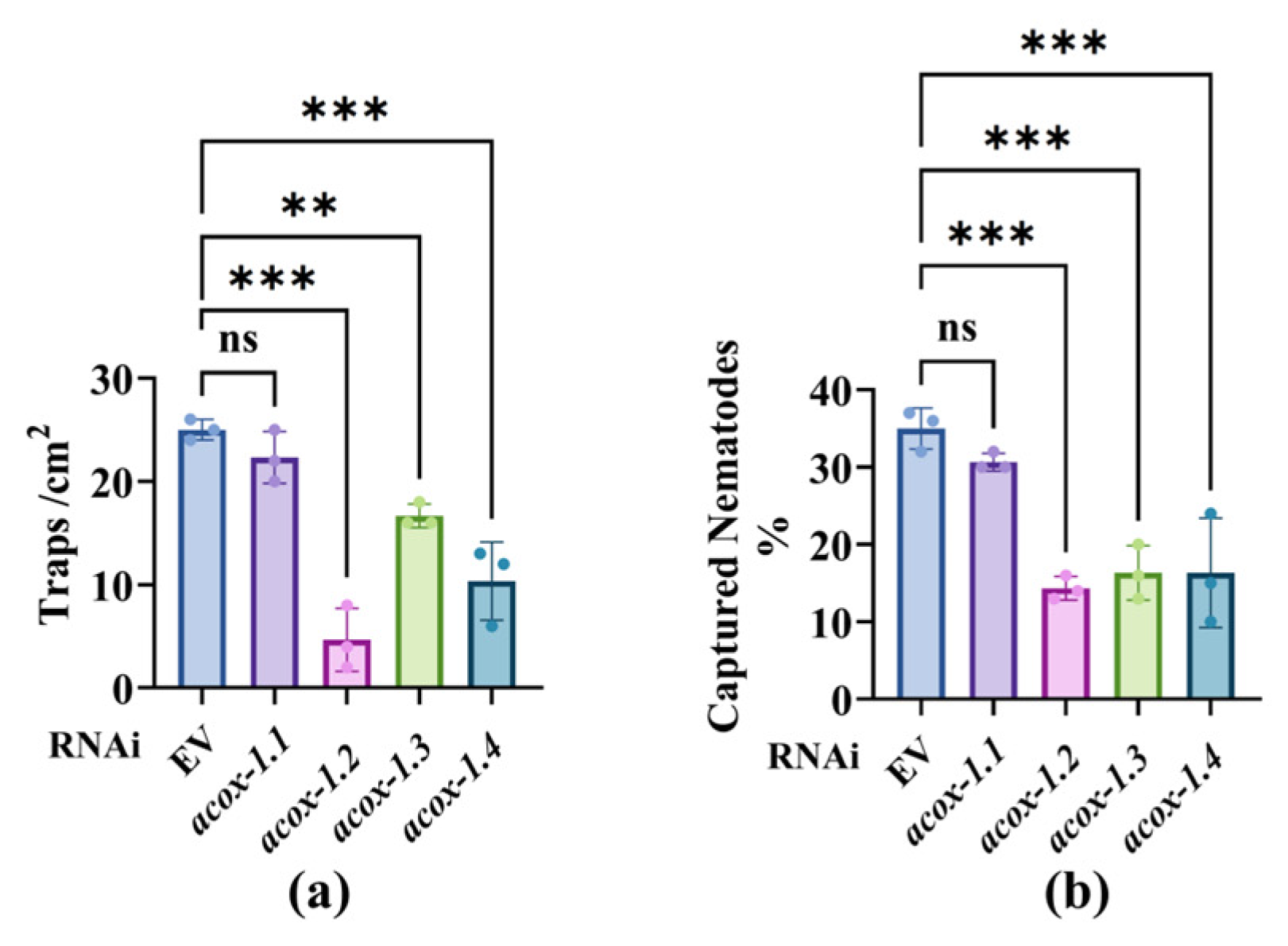 ACOX-1 regulated the trapping and capture behavior of A. oligospora under feeding conditions: (a) Trap density on A. oligospora plates for EV and isoform genes RNAi (acox-1.1, acox-1.2, acox-1.3, acox-1.4). (b) Quantification of captured fraction (%). These results are means ± SD of three independent experiments. ns, no significance, ** p < 0.01, *** p < 0.001. p-values (a,b) were calculated using one-way ANOVA with Dunnett’s multiple-comparison correction test.