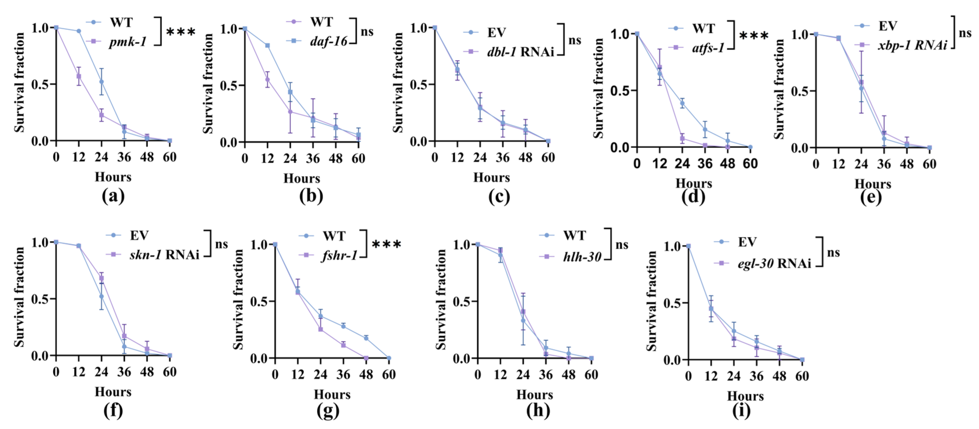 The worms depend on PMK-1, ATFS-1, and FSHR-1 for survival during A. oligospora Predation: (a–i) Kaplan–Meier survival fractions of C. elegans exposed to A. oligospora. During A. oligospora predation, survival required pmk-1 (a), atfs-1 (d), and fshr-1 (g), whereas daf-16, dbl-1 (RNAi), xbp-1 (RNAi), skn-1 (RNAi), hlh-30, and egl-30 (RNAi) were dispensable (b,c,e,f,h,i). Kaplan–Meier curves with WT or EV controls as indicated. Shown is a representative experiment of three independent repeats (n = 100 per group). ns, no significance, *** p < 0.001. p-values (a–i) were calculated by two-sided log-rank (Mantel–Cox) tests.