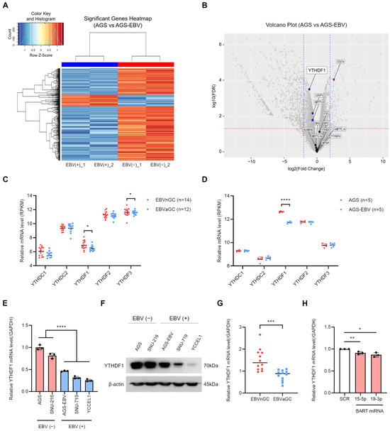 To investigate how EBV infection influences m6A modification, we compared AGS gastric cancer cells and their EBV-infected counterpart, AGS-EBV. These two cell lines are genetically identical except for EBV status. Differentially expressed gene (DEG) analysis revealed 839 significantly altered genes among 15,109 total genes, as shown in the heatmap (Figure 1A) and volcano plot (Figure 1B). Among m6A-related genes, YTHDF1 expression was notably reduced in EBV-positive cells compared with EBV-negative cells (Figure 1A,B). To extend these findings, we analyzed microarray data from 14 EBV-negative and 12 EBV-positive gastric cancer tissues (GEO: GSE51575). Expression of YTHDF1 and YTHDF3 was significantly decreased in EBV-positive tumors relative to EBV-negative tumors (Figure 1C). In contrast, analysis of another dataset from our laboratory (GEO: GSE135644) confirmed that YTHDF1 expression was reduced in AGS-EBV cells, whereas YTHDF3 showed no significant change (Figure 1D). We next validated these transcriptomic results using gastric cancer cell lines. EBV-positive cell lines (AGS-EBV, SNU719, YCCEL1) exhibited markedly lower YTHDF1 expression at both the mRNA and protein levels compared with EBV-negative cell lines (AGS, SNU216) (Figure 1E,F). Consistent with these results, patient-derived gastric cancer tissues (12 EBV-negative and 12 EBV-positive) showed significantly decreased YTHDF1 mRNA expression in EBV-associated gastric cancer (EBVaGC) compared with EBV-negative gastric cancer (EBVnGC) (Figure 1G). To explore the mechanism underlying YTHDF1 suppression in EBVaGC, we examined the potential role of EBV BART miRNAs. Target prediction analysis identified miR-BART15-5p and miR-BART19-3p as candidate regulators with seed sequence complementarity to the YTHDF1 3′ UTR (Supplementary Figure S3). Transfection of AGS cells with these miRNA mimics significantly reduced YTHDF1 mRNA expression compared with scramble controls, as shown by qRT-PCR (Figure 1H). Together, these results indicate that EBV infection suppresses YTHDF1 expression in gastric cancer, at least in part through regulation by EBV BART miRNAs.