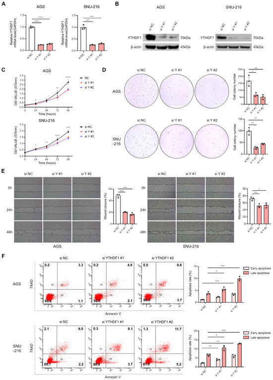 To investigate the functional role of YTHDF1 in gastric cancer, we designed two independent siRNAs targeting different regions of YTHDF1 mRNA. qRT-PCR and Western blot analysis confirmed that both siRNAs effectively reduced YTHDF1 expression (Figure 2A,B). Functional assays revealed that YTHDF1 knockdown significantly inhibited cell proliferation, as shown by MTT and colony formation assays (Figure 2C,D). Wound healing assays further demonstrated that YTHDF1 depletion impaired the migratory capacity of EBV-negative gastric cancer cells (Figure 2E). In addition, YTHDF1 silencing markedly increased apoptosis, as assessed by flow cytometry (Figure 2F). These results collectively indicate that YTHDF1 is essential for maintaining the malignant properties of gastric cancer cells.