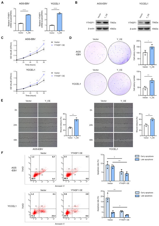 To assess the effect of YTHDF1 on the tumorigenic properties, we generated a YTHDF1 overexpression vector and introduced it into two EBV-positive gastric cancer cell lines. Successful overexpression was confirmed by qRT-PCR and Western blot analyses (Figure 3A,B). MTT and colony formation assays demonstrated that YTHDF1 overexpression significantly enhanced cell proliferation (Figure 3C,D). Similarly, wound healing assays revealed that YTHDF1 overexpression markedly promoted cell migration (Figure 3E). Flow cytometric analysis following 7-AAD and Annexin V staining showed that YTHDF1 overexpression significantly reduced apoptosis in EBV-positive gastric cancer cells (Figure 3F). Together, these findings indicate that YTHDF1 acts as a critical regulator that promotes the malignant phenotype of gastric cancer by enhancing cell proliferation and migration.