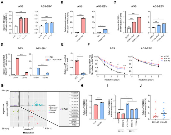 YTHDF1 regulates TSC22D1 mRNA stability in an m6A-dependent manner. (A) qRT-PCR analysis of TSC22D1 mRNA levels following YTHDF1 knockdown. (B) RIP-qPCR using a YTHDF1 antibody was performed to determine the direct interaction between YTHDF1 and TSC22D1 mRNA. Data were quantified using ΔCt values relative to input RNA. (C) qRT-PCR analysis of TSC22D1 mRNA levels after treatment with the METTL3 inhibitor UZH1a. (D) RIP-qPCR was conducted to assess the change in YTHDF1-TSC22D1 mRNA interaction following UZH1a treatment. The data were quantified as ΔCt values relative to input RNA. (E) m6A immunoprecipitation (IP) followed by qRT-PCR was performed to analyze the m6A methylation levels of TSC22D1 mRNA in AGS and AGS-EBV cells. (F) RNA stability assay using Actinomycin D was conducted to evaluate the effect of YTHDF1 knockdown on TSC22D1 mRNA stability. (G) Integration of differentially expressed genes (DEGs; RNA-seq) and differentially methylated regions (DMRs; MeRIP-seq) between AGS and AGS-EBV cells. The x-axis indicates changes in m6A methylation (m6A logFC), and the y-axis indicates changes in gene expression (expression logFC). Genes in the upregulated–hypomethylated (up-hypo) quadrant, showing increased expression with reduced m6A modification, are highlighted. Vertical dashed lines indicate the thresholds used to define changes in m6A methylation (m6A logFC), and the horizontal dashed line indicates the threshold for gene expression changes (expression logFC). These cutoff lines divide the plot into quadrants used to identify combined methylation–expression patterns. (H) TSC22D1 mRNA expression levels were compared between AGS and AGS-EBV cells using microarray data generated in our laboratory (GEO: GSE135644). (I) qRT-PCR analysis of TSC22D1 mRNA expression in EBV-negative (AGS, SNU216) and EBV-positive (SNU719, YCCEL1) gastric cancer cell lines. (J) Tissue-level validation of TSC22D1 expression using primary human gastric cancer specimens. qRT-PCR was performed to compare TSC22D1 mRNA levels between EBV-negative and EBV-positive tumors. p-values: * p < 0.05; ** p < 0.01; *** p < 0.001; **** p < 0.0001.