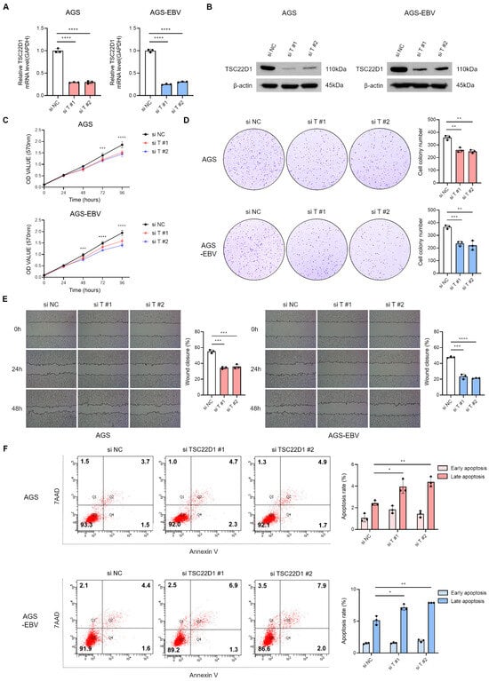 Functional impact of TSC22D1 knockdown in gastric cancer cells. qRT-PCR (A) and Western blot (B) analyses were performed to assess TSC22D1 expression levels following siRNA-mediated TSC22D1 knockdown in AGS and AGS-EBV cells. MTT assay (C) and colony formation assay (D) were conducted to assess the impact of TSC22D1 knockdown on cell proliferation and oncogenicity. Both experiments were independently performed three times, and representative results are shown in (C,D). (E) Wound healing assay was performed to assess the effect of TSC22D1 knockdown on cell migration in AGS and AGS-EBV cells. (F) Flow cytometry analysis using Annexin V/7-AAD staining was conducted to evaluate apoptosis following TSC22D1 knockdown in AGS and AGS-EBV cells. p-values: * p < 0.05; ** p < 0.01; *** p < 0.001; **** p < 0.0001.