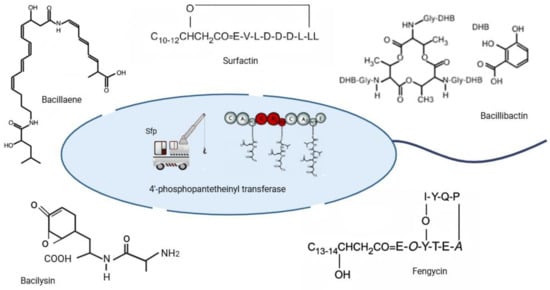 - Jacques, P. Surfactin and other lipopeptides from Bacillus spp. In Biosurfactants: From Genes to Applications; Springer: Berlin/Heidelberg, Germany, 2011; pp. 57–91. [Google Scholar]