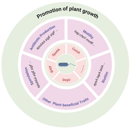 | DegS, DegU, PhoP, PhoR, ResD and ResE | Sensor–regulator systems | Adaptation to nutrient availability, oxygen, phosphate, and plant signals | [28,29,30] | |