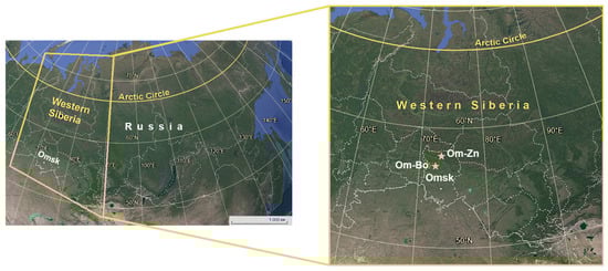 Sampling was conducted in 2016, 2024, and 2025 at two locations of approximately 20 km2 each within the forest zone of Omsk province, Western Siberia; the sampling locations and tick collection from small mammals have been previously described [12]. Briefly, the first site (Om-Bo) was located in Bolsheukov district (56°46′ N, 72°03′ E), and the second site (Om-Zn) was situated in Znamenskiy district (57°23′ N, 73°40′ E) (Figure 1). Small mammals were captured using live traps, and attached Ixodes spp. ticks were removed by forceps. Some engorged larvae were transported to the laboratory and allowed to molt into nymphs, while other ticks were frozen and stored at −70 °C until DNA extraction. In addition, unfed adult I. persulcatus specimens were collected by flagging from vegetation. Identification of questing ticks was carried out using a stereomicroscope, MC-800 (Micros, Sankt Veit an der Glan, Austria), according to morphological criteria [28]. To identify ticks collected from small mammals, multiplex PCR for the ITS2 locus with primers specific to I. persulcatus, I. trianguliceps, and I. apronophorus (Table 1) was conducted, as previously described [29].
