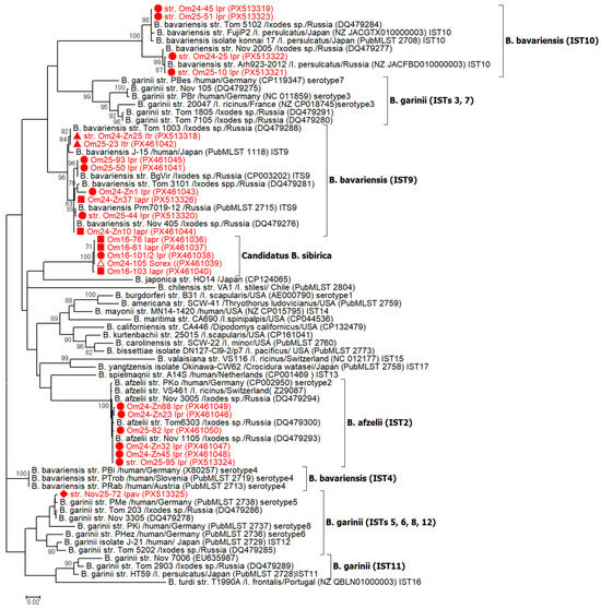 Twelve of the “Candidatus B. sibirica” samples were detected in Ixodes spp. collected from rodents at the Om-Bo site in 2016. This subset included three new specimens identified in this study and nine isolates that were previously described [12]. The remaining “Candidatus B. sibirica” sample was identified in the blood of S. araneus captured in 2024 at the Om-Zn site [33] (Table 3). Of the six genotyped B. afzelii samples, five samples were identified directly in I. persulcatus from both locations, and one sample was from a strain isolated from I. persulcatus. The sixteen B. bavariensis specimens were identified from the following sources: six samples from cultured strains from I. persulcatus (n = 5) and I. trianguliceps (n = 1); three samples from questing I. persulcatus (n = 3); and seven samples from molted ticks, including I. persulcatus (n = 4), I. apronophorus (n = 2), and I. trianguliceps (n = 1) (Table 3). In addition, one B. garinii strain isolated from I. pavlovskyi from Novosibirsk Province was genotyped for the ospA gene (Table 3).