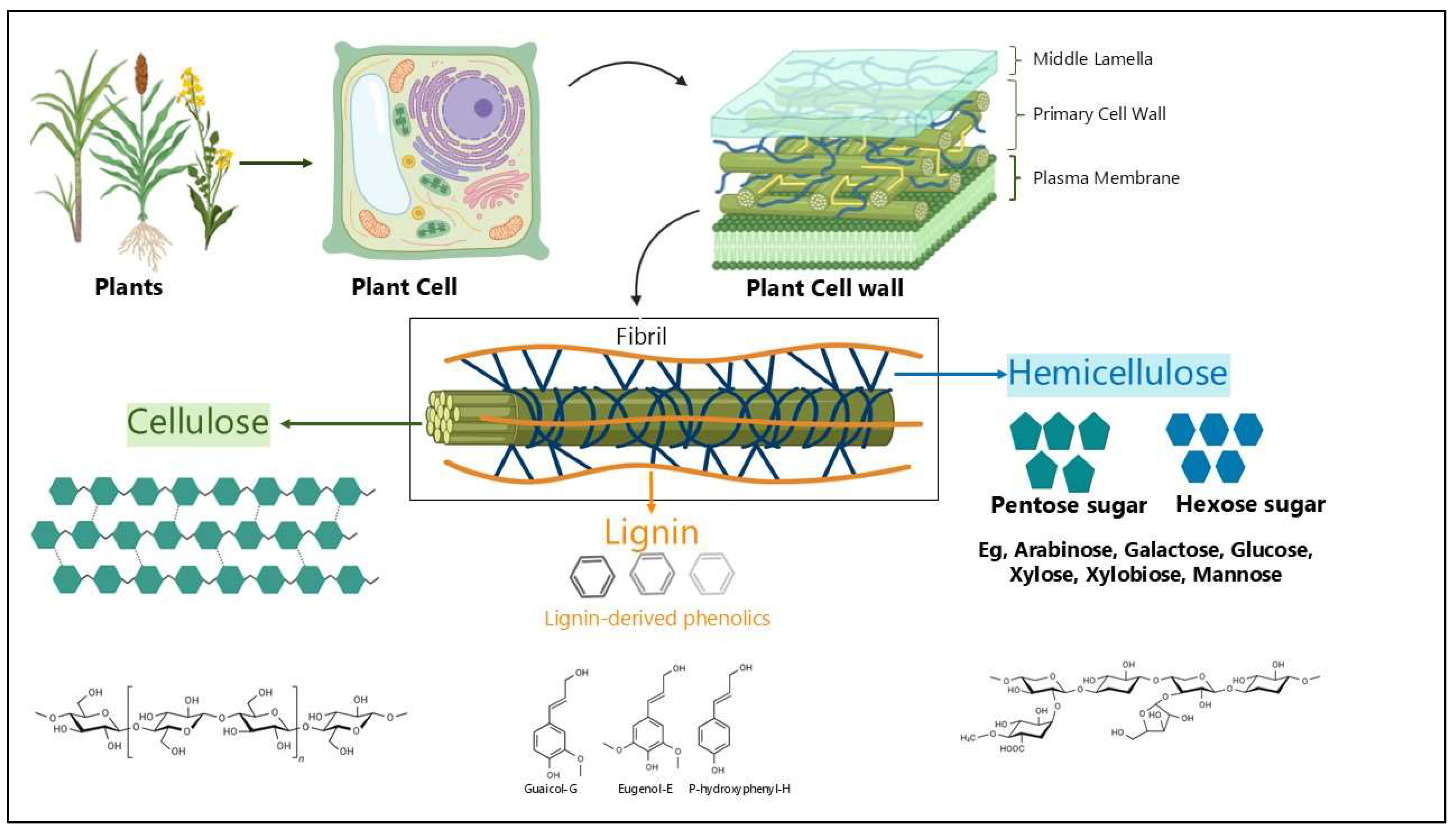 - Dhakal, R. Schematic Representations of Plant Cell Walls and Their Main Components: Cellulose, hemicellulose, and Lignin. Creat BioRender. 2025. Available online: https://BioRender.com/wr521rv (accessed on 2 December 2025).