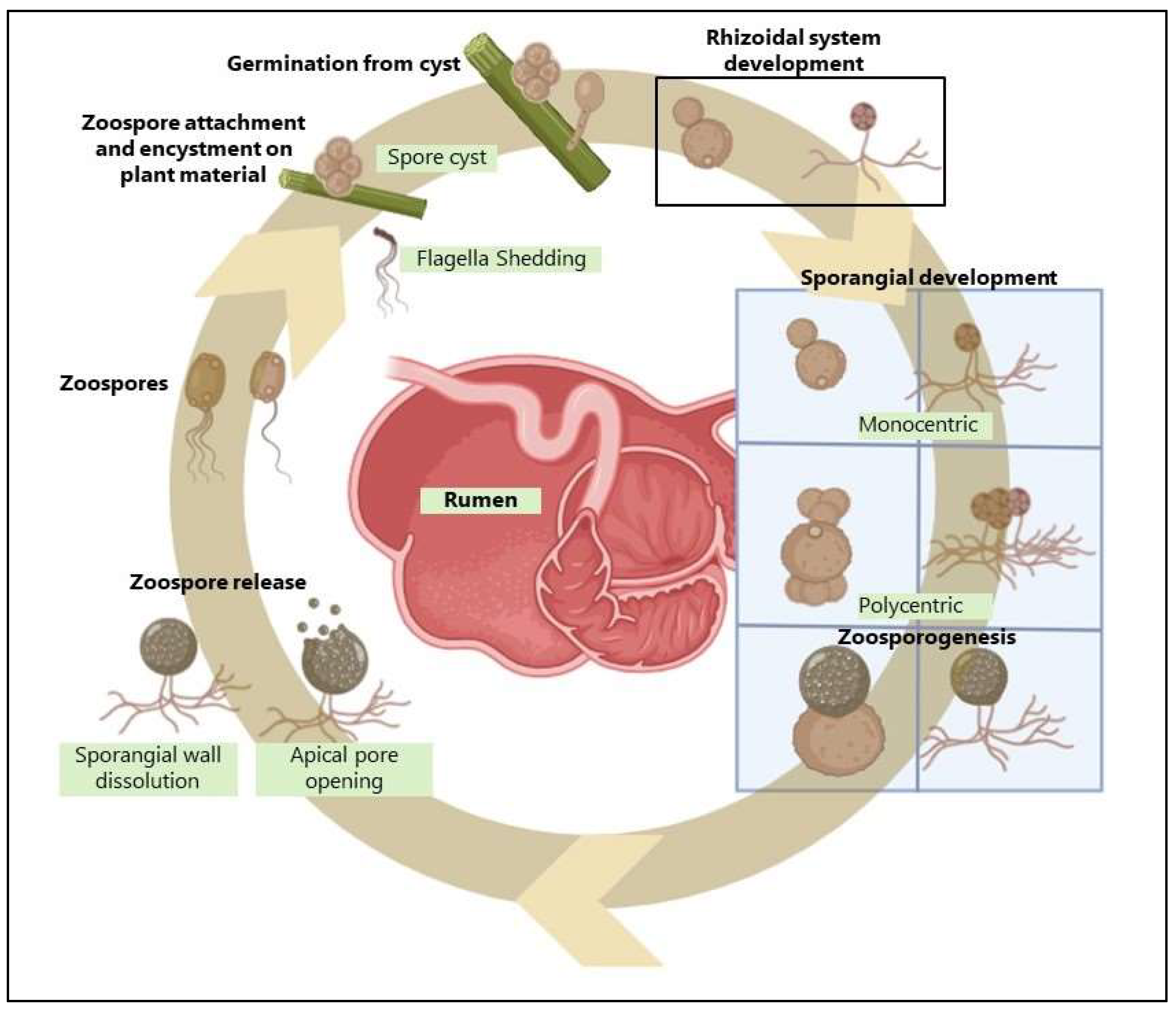 - Dhakal, R. The Life Cycle of Neocallimastigomycota in the Rumen. Creat BioRender. 2025. Available online: https://BioRender.com/38ghp37 (accessed on 2 December 2025).