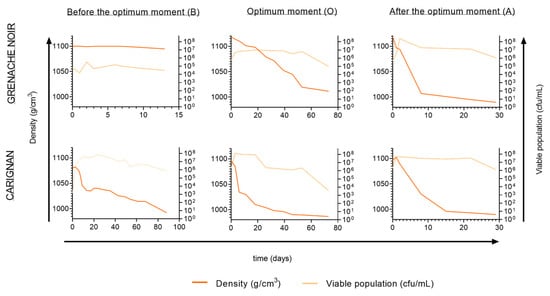 Evolution of spontaneous fermentations for Grenache Noir and Carignan grape varieties, harvested at the three maturity stages (B, before the optimum moment; O, at the optimum moment; A, after the optimum moment).