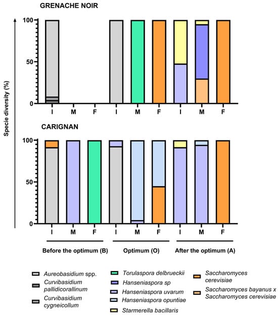 Diversity of species isolated and identified in the Carignan and Grenache Noir grape varieties according to the harvest time (B for before the optimum moment, O for the optimum moment, and A for after the optimum moment) and the stage of alcoholic fermentation (I for the start of fermentation, M for mid-fermentation, and F for the end of fermentation).