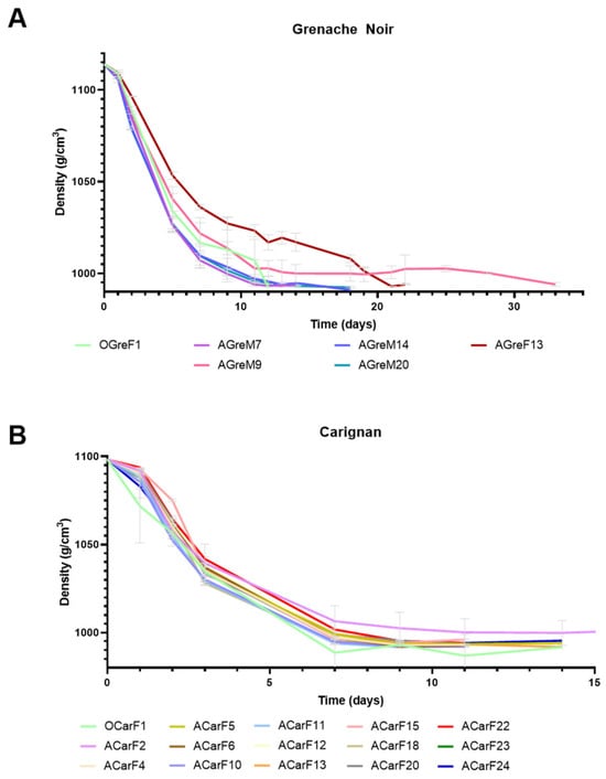Fermentation performance of strains isolated from grapes at different maturity stages ((A) for Grenache Noir and (B) for Carignan) and fermentation points, expressed as density. Letters in strain names identify different harvesting states ( O for optimum moment, and A for after the optimum moment), grape varieties (Gre for Grenache Noir and Car for Carignan), and fermentation sampling stages (M for mid-fermentation and F for final fermentation stage). Data are expressed as mean values, and error bars represent standard deviations (n = 2).