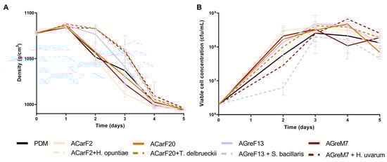 Fermentation performance at pilot scale of wines fermented with different strains. Single fermentations with the S. cerevisiae strains, ACarF20, ACarF2, AGreM7, and AGreF13, and mixed fermentations with these S. cerevisiae strains sequentially inoculated with strains of the following non-Saccharomyces species: T. delbrueckii, H. opuntiae, H. uvarum, and S. bacillaris. (A) Density. (B) Viable cell concentration. Data are expressed as mean values (with standard deviation shown as error bars) of n = 2.
