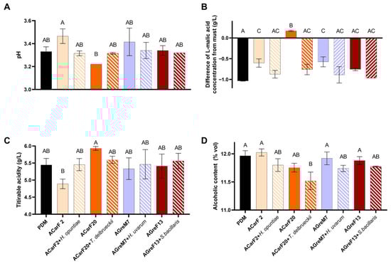 Chemical composition of wines produced by strains isolated from different maturity stages of grapes and by fermentation points. Single fermentations with the S. cerevisiae strains ACarF20, ACarF2, AGreM7, and AGreF13 and mixed fermentations with these S. cerevisiae strains sequentially inoculated with strains of the following non-Saccharomyces species: T. delbrueckii, H. opuntiae, H. uvarum, and S. bacillaris. (A) pH; (B) L-malic acid reduction from must to wine; (C) titratable acidity; and (D) alcoholic content. Data are expressed as mean values (with standard deviation shown as error bars) of n = 2 and were analyzed by ANOVA and Tukey HSD post-test (p > 0.05). Statistically significant differences are indicated by different letters (A, B, C).