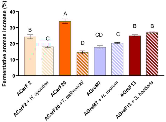 Increase in fermentative aromas of wines compared to the commercial control (PDM). Single fermentations with the S. cerevisiae strains ACarF20, ACarF2, AGreM7, and AGreF13 and mixed fermentations with these S. cerevisiae strains sequentially inoculated with strains of the following non-Saccharomyces species: T. delbrueckii, H. opuntiae, H. uvarum, and S. bacillaris. Data are expressed as mean value (and standard deviation in the error bar) of n = 2 by ANOVA and Tukey HSD post-test (p > 0.05), and statistically significative differences are indicated by different letters (A, B, C, D).