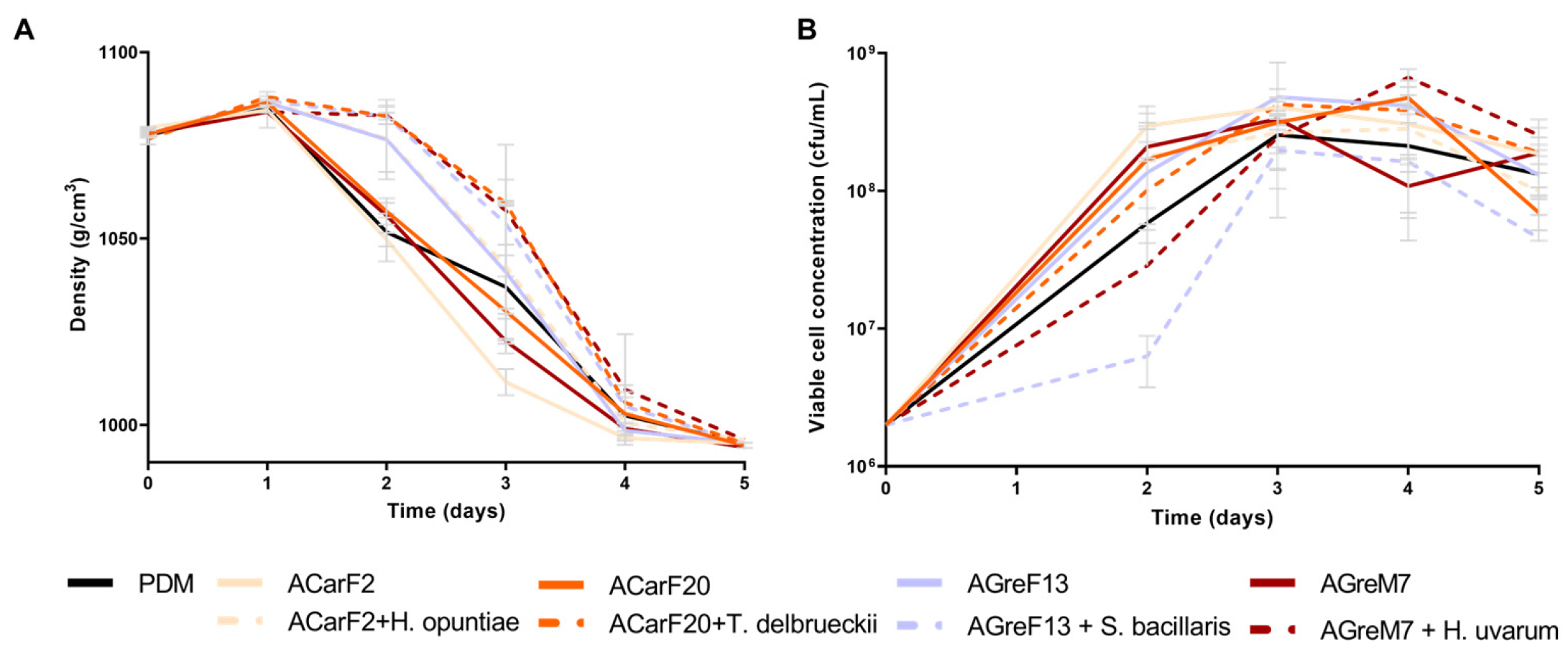 | PDM | ACarF20 | ACarF20 + T. delbrueckii | ACarF2 | ACarF2 + H. opuntiae | AGreM7 | AGreM7 + H. uvarum | AGreF13 | AGreF13 + S. bacillaris | |