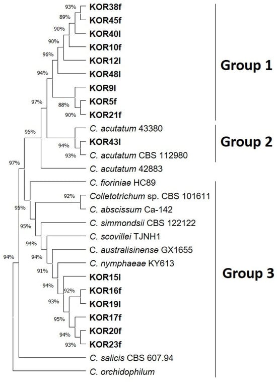 Phylogenetic tree obtained using concatenated sequences of KLAP1, TUB2, and HISTONE-H3 genes of all isolated Colletotrichum strains. The strains Colletotrichum salicis CBS 607.94 and Colletotrichum orchidophilum were used as outgroup sequences. The evolutionary history was inferred by using the maximum likelihood method and Tamura–Nei model [36]. Evolutionary analyses were conducted in MEGA11 [37].