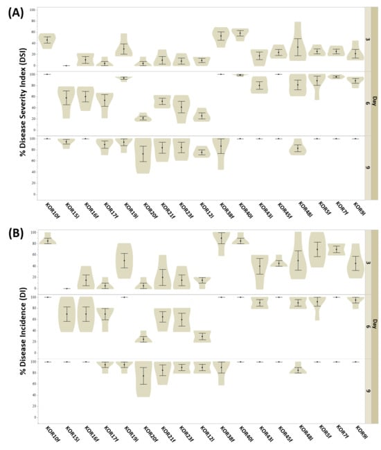 The majority of the isolates, including KOR5f, KOR7f, KOR10f, KOR16f, KOR45f, KOR9l, KOR19l, KOR40l, and KOR43l, exhibited a significantly high level of virulence. These strains exhibited disease incidence (DI) values ranging from 95% to 100% and disease severity index (DSI) scores between 75% and 100% at nine days post-inoculation (dpi) (Figure 4A,B). Notably, most of these isolates began expressing visible symptoms as early as 3 dpi, indicating their high infection capability. Among them, isolates KOR10f, KOR45f, KOR38f, and KOR40l were identified as the most aggressive based on both the rapid onset and intensity of disease symptoms. Conversely, isolates KOR20f, KOR21f, and KOR23f—taxonomically assigned to C. scovillei—and KOR12l, classified within the acutatum species complex, exhibited significantly reduced virulence. These strains caused only mild symptoms, with both DI and DSI values remaining at comparatively low levels throughout the observation period (Figure 4, Table S2).